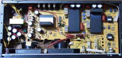 黒い箱が2つ並んでいるのは、おそらく2チャンネル(左右ch)の信号処理ブロックとみて間違いないでしょう。シールドカバーは半田付けされているだけです。